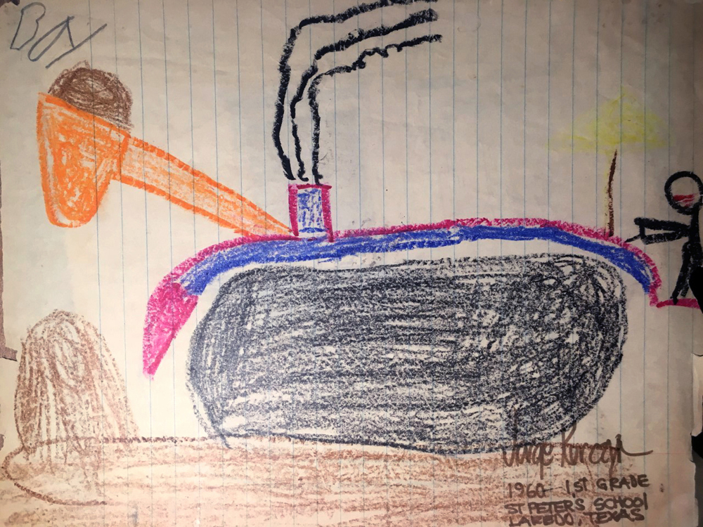 At the age of six, I discovered my talent for drawing. In first grade at St. Peter's Catholic School, my teacher, Mother Augustine, asked the class to sit down and color with eight different crayons in a red notebook. She told us to draw whatever came to our minds. The day before, I had been captivated by a big tractor working in front of our house, so that became the subject of my drawing. Mother Augustine was impressed with my drawing and displayed it on our classroom's bulletin board. It was the first time I received an "A" in art, and from that moment on, I became more interested in art and mechanical movements.